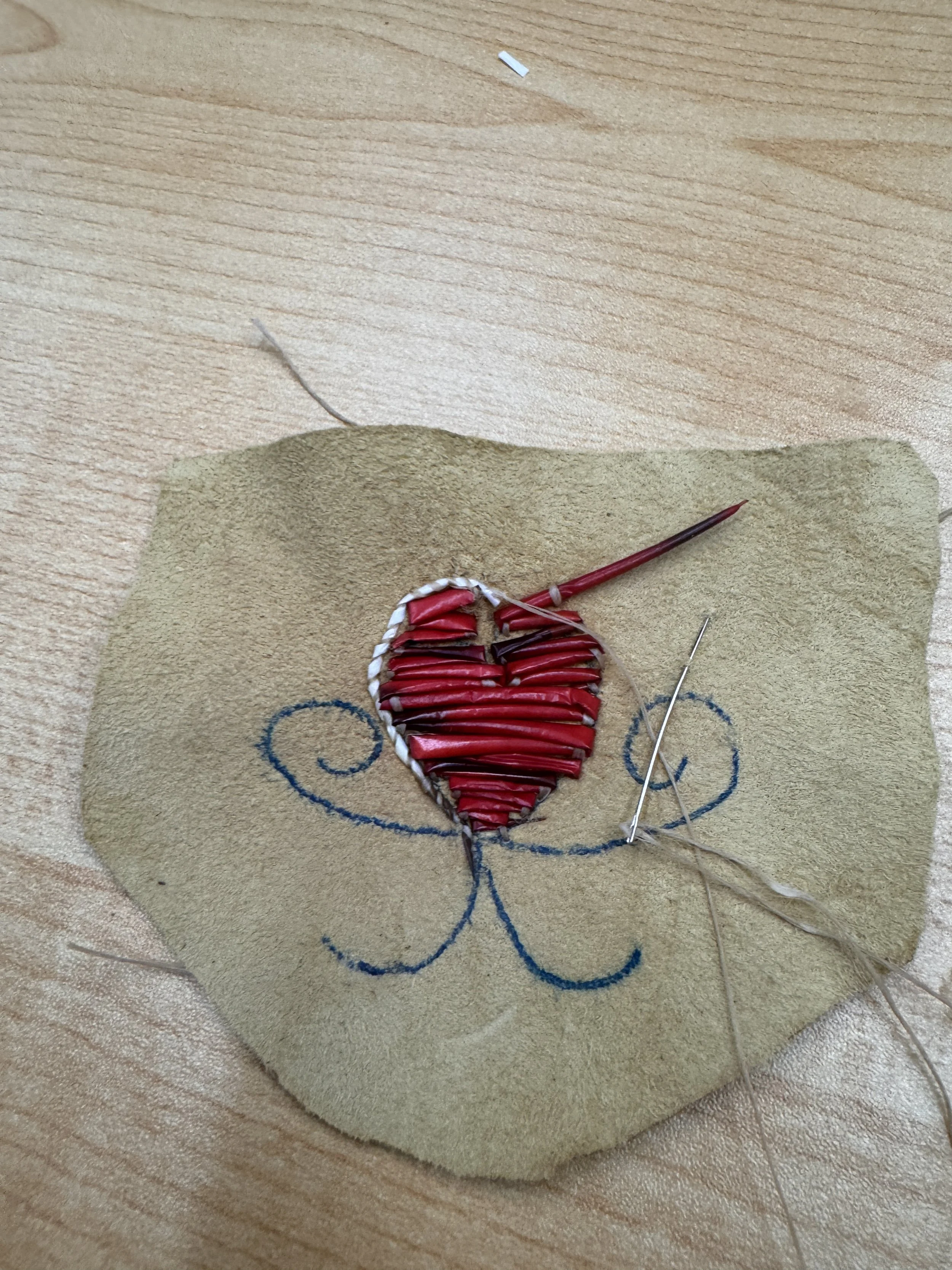 Students first learned a single row stitch and were urged to practice it on small scraps of deerskin. The quills were soaked in water to make them pliable. Choosing a quill to begin, they snipped off the end that had been plucked from the skin and then using a leather needle and artificial sinew they practiced tacking them down in pleasing arrangements. Nearing the end of a quill, another quill would be inserted by the sharp barbed tip in the hollow end of the one in progress, and so on. Mistakes were to be expected as the skill for quillwork is earned, often after stabbing oneself a few times with a quill!